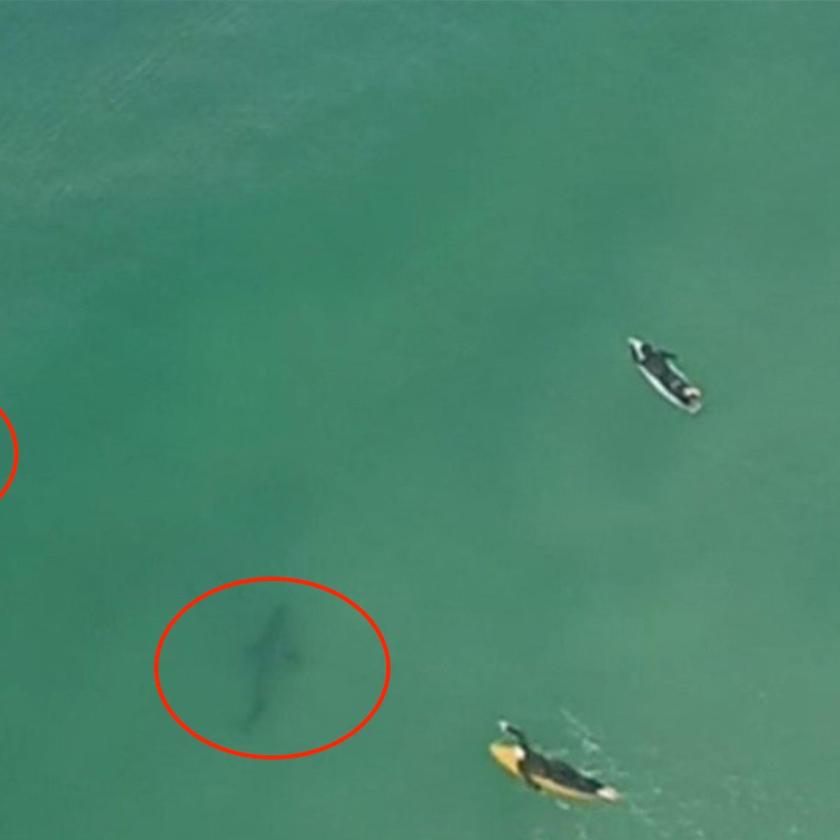 A great white shark approaches surfers at tuncurry beach.